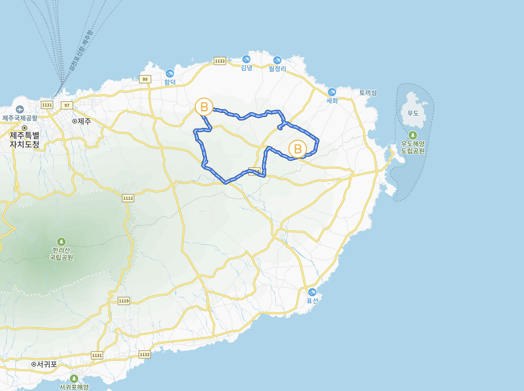 - 운행 구간: 대천환승정류장 → 거슨세미오름 → 안돌오름 → 아부오름 → 송당리마을 → 다랑쉬오름 → 용눈이오름 → 제주레일바이크 → 비자림 → 메이즈랜드 → 둔지오름 → 덕천리마을 → 어대오름 → 한울랜드 → 동백동산습지센터 → 알밤오름 → 다희연 → 선인동마을 → 선녀와나무꾼 → 선흘2리마을 → 제주세계자연유산센터 → 거문오름 → 대천환승정류장